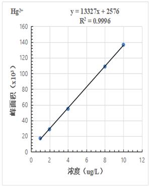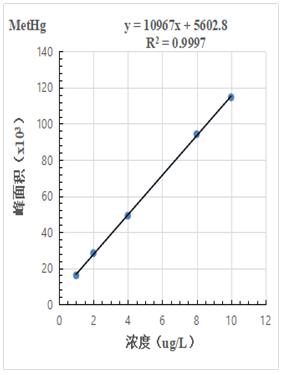 1.0μg/L、2.0.μg/L、4.0μg/L、8.0μg/L、10.0μg/L 汞形態(tài)混合標準溶液分離色圖譜如圖3所示,其中無機汞(Hg2+)、甲基汞(MetHg)、乙基汞(EtHg)相對保留時間分別為118s、185s、379s,從譜圖疊加圖上可以看出,三種汞形態(tài)出峰時間穩(wěn)定,且分離度較好。