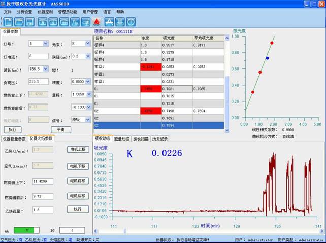 樣品測試:于原子吸收光譜儀波長766.5nm處,使用空氣-乙炔火焰,以水調(diào)零,測量試液的吸光度,減去隨同試料的空白試驗溶液的吸光度,從工作曲線上查出相應(yīng)的鉀濃度。