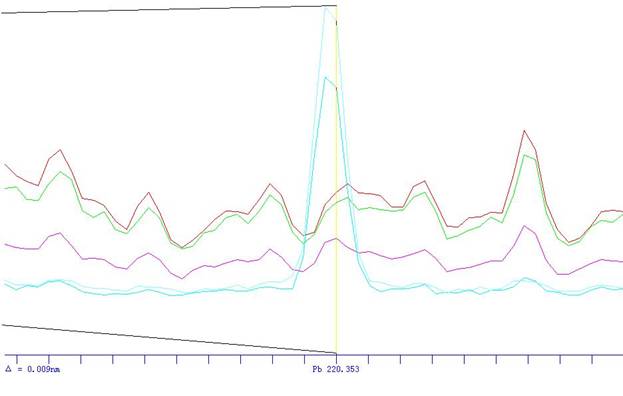 根據(jù)ICP軟件譜線庫提供所有元素不同譜線,首先選擇被測元素靈敏度高 的譜線,其次考慮不受樣品基體及被測元素相互之間干擾小的譜線的原則,選擇分析線如下。