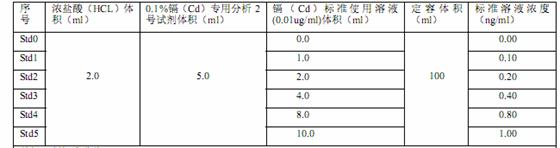 使用鎘(Cd)標(biāo)準(zhǔn)使用溶液(0.01ug/ml),優(yōu)級純鹽酸(HCL) ,0.1%鎘(Cd)專用分析 2 號試劑,去離子水(電阻率≥10M歐姆)等試劑。