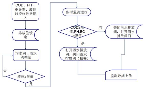 監(jiān)測系統(tǒng)控制采樣單元將水樣導入監(jiān)測室,并啟動監(jiān)測水質(zhì)的COD、pH、電導率等常規(guī)參數(shù)。達標雨水通過電控閥門排入市政雨水管網(wǎng),一旦超標電控閥門關(guān)閉,禁止雨水排入市政雨水管網(wǎng),并通過水泵將超標雨水泵入企業(yè)污水處理系統(tǒng)處理,達標后排放至市政污水管網(wǎng)。同時所有監(jiān)測數(shù)據(jù)經(jīng)由數(shù)據(jù)采集單元將數(shù)據(jù)統(tǒng)計后,由傳輸設(shè)備傳輸至企業(yè)監(jiān)測中心或環(huán)保局,由此完成對雨水排放自動、實時、連續(xù)監(jiān)控。