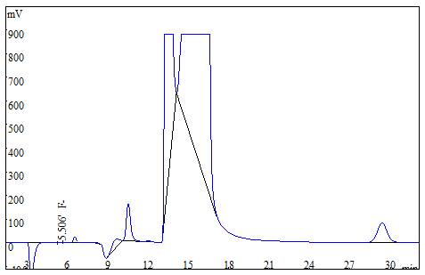 將大米、茶葉試樣分別粉粹后過篩,各稱取0.25g(精確至0.0001g),于氧彈燃燒儀進(jìn)行燃燒,冷卻后定容,經(jīng)0.22μm的水系濾膜過濾后上機(jī)得到樣品譜圖,如下圖3、圖4所示;食用油樣品直接稱重后進(jìn)行氧彈燃燒,測試得到的譜圖如圖5所示;生活飲用水直接上機(jī)后得到樣品譜圖詳見圖6。其中大米、茶葉、食用油中氟離子的測定結(jié)果均低于方法檢出限,同時(shí)對4種試樣進(jìn)行了加標(biāo)處理,加標(biāo)回收率在95.6%~102.3%之間。測試數(shù)據(jù)詳見表2。