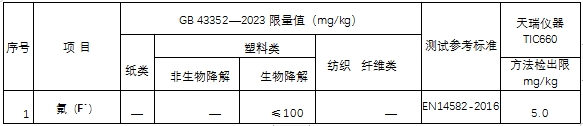 參照EN14582-2016標(biāo)準(zhǔn),樣品用氧彈燃燒儀燃燒后冷取、定容,經(jīng)0.22μm水系濾膜過(guò)濾后,用天瑞儀器離子色譜儀TIC660進(jìn)行測(cè)試,以保留時(shí)間和色譜峰進(jìn)行定性,外標(biāo)法進(jìn)行定量;方法檢出限5.0mg/kg,加標(biāo)回收率為106%。通過(guò)本實(shí)驗(yàn)結(jié)果表明,該方法檢出限低、靈敏度高、穩(wěn)定性好、方法回收率高,且前處理方法簡(jiǎn)單,可滿足快遞外包裝袋中氟離子的測(cè)試需求。