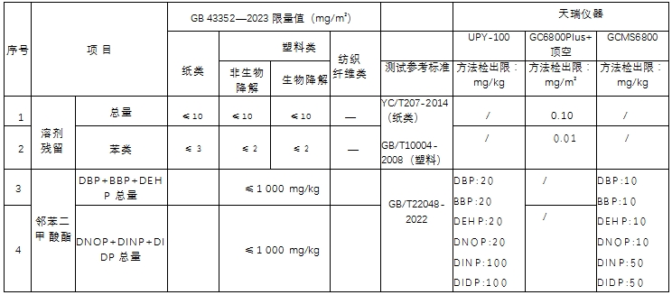 表 5. 溶劑殘留、鄰苯二甲酸酯類(lèi)物質(zhì)限量及檢測(cè)一覽表