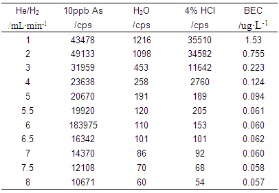 儀器首先在標(biāo)準(zhǔn)模式下進行參數(shù)優(yōu)化(利用10μg·L-1的Li、Co、In、U、Ce調(diào)諧液對儀器工作參數(shù)進行調(diào)節(jié),使儀器靈敏度高,同時氧化物及雙電荷產(chǎn)率小于3%);再開啟He/H2碰撞反應(yīng)氣,逐步增大He/H2流量,測試超純水、4%HCl及10μg·L-1 As(4%HCl介質(zhì))在75amu處的響應(yīng)信號,計算其背景等效濃度(詳細(xì)數(shù)據(jù)見表1及圖1);并利用As標(biāo)液進一步優(yōu)化He/H2流量,得到儀器工作參數(shù)如表2所示。