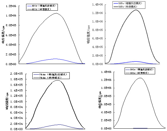 圖3.52Cr、56Fe、75As、80Se在標(biāo)準(zhǔn)模式及碰撞反應(yīng)模式下響應(yīng)信號(52Cr、56Fe)