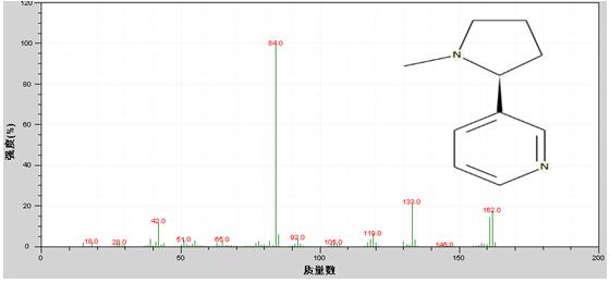 尼古丁(Nicotine),俗名煙堿,是一種存在于茄科植物(茄屬)中的生物堿,也是煙草的重要成分之一。尼古丁會(huì)使人上癮或產(chǎn)生依賴性,重復(fù)使用可導(dǎo)致心臟速度增加、血壓升高和食欲降低,攝入大劑量尼古丁會(huì)引起惡心甚至嘔吐,嚴(yán)重禍及死亡。氣相色譜質(zhì)譜聯(lián)用儀(GCMS),采用氣相色譜分離和電子轟擊電離源(EI)配合全掃描模式完成定性分析,GCMS-SIM模式實(shí)現(xiàn)定量分析,可應(yīng)用于煙草中尼古丁的檢測(cè)。