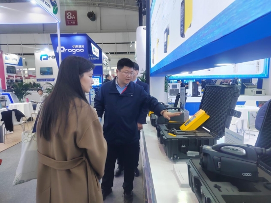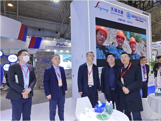 中國環(huán)境監(jiān)測總站副站長毛玉如蒞(左三)臨天瑞儀器展臺參觀,天瑞儀器副總經(jīng)理、磐合科儀董事長黎橋(右一)熱情接待