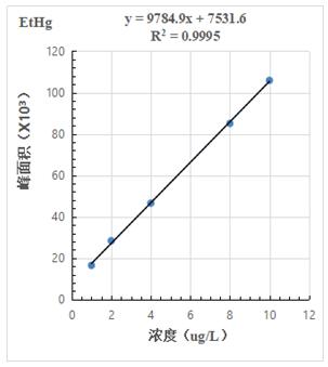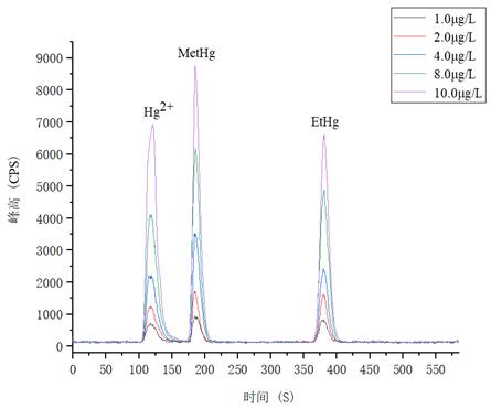 1.0μg/L、2.0.μg/L、4.0μg/L、8.0μg/L、10.0μg/L 汞形態(tài)混合標準溶液分離色圖譜如圖3所示,其中無機汞(Hg2+)、甲基汞(MetHg)、乙基汞(EtHg)相對保留時間分別為118s、185s、379s,從譜圖疊加圖上可以看出,三種汞形態(tài)出峰時間穩(wěn)定,且分離度較好。