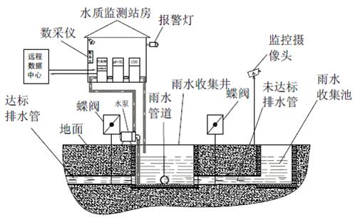 監(jiān)測系統(tǒng)控制采樣單元將水樣導入監(jiān)測室,并啟動監(jiān)測水質(zhì)的COD、pH、電導率等常規(guī)參數(shù)。達標雨水通過電控閥門排入市政雨水管網(wǎng),一旦超標電控閥門關(guān)閉,禁止雨水排入市政雨水管網(wǎng),并通過水泵將超標雨水泵入企業(yè)污水處理系統(tǒng)處理,達標后排放至市政污水管網(wǎng)。同時所有監(jiān)測數(shù)據(jù)經(jīng)由數(shù)據(jù)采集單元將數(shù)據(jù)統(tǒng)計后,由傳輸設(shè)備傳輸至企業(yè)監(jiān)測中心或環(huán)保局,由此完成對雨水排放自動、實時、連續(xù)監(jiān)控。