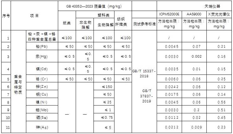 針對剛正式實施的快遞包裝首個國標,參考GB43352標準,采用ICP-MS2000E測定快遞塑料包裝袋中鉛汞鎘鉻等十項金屬元素,各元素檢出限在0.012~0.097μg/L,加標回收率在94.4%~102.2%之間,精密度在1.15%~6.60%之間;各元素測量值均在國標要求的限值范圍內(nèi)。本實驗結果表明該方法具有良好的穩(wěn)定性及精密度,完全滿足快遞塑料包裝袋中重金屬元素的測定。