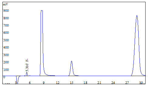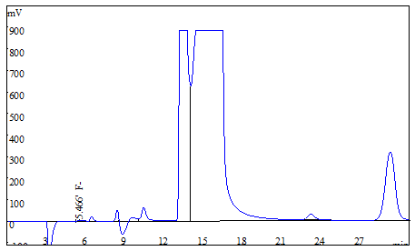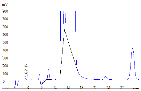 將大米、茶葉試樣分別粉粹后過篩,各稱取0.25g(精確至0.0001g),于氧彈燃燒儀進(jìn)行燃燒,冷卻后定容,經(jīng)0.22μm的水系濾膜過濾后上機(jī)得到樣品譜圖,如下圖3、圖4所示;食用油樣品直接稱重后進(jìn)行氧彈燃燒,測試得到的譜圖如圖5所示;生活飲用水直接上機(jī)后得到樣品譜圖詳見圖6。其中大米、茶葉、食用油中氟離子的測定結(jié)果均低于方法檢出限,同時(shí)對4種試樣進(jìn)行了加標(biāo)處理,加標(biāo)回收率在95.6%~102.3%之間。測試數(shù)據(jù)詳見表2。