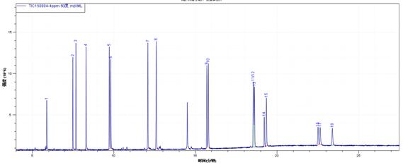 1. α-六六六;2. β-六六六;3. γ-六六六;4. 蒽-D10(內(nèi)標(biāo));5. δ-六六六;6. 七氯;7. 艾氏劑;8. 環(huán)氧七氯B;9. γ-氯丹;10. 硫丹I;11. α-氯丹;12. 4,4'-DDE;13. 狄氏劑; 14. 異狄氏劑;15. 硫丹 II;16. 4,4'- DDD; 17. 異狄氏醛;18. 硫丹硫酸酯;19. 4,4'-DDT;20. 異狄氏酮; 21. 甲氧DDT;22. 苝-D12(替代物);