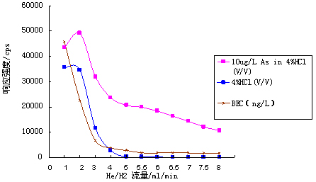 儀器首先在標(biāo)準(zhǔn)模式下進行參數(shù)優(yōu)化(利用10μg·L-1的Li、Co、In、U、Ce調(diào)諧液對儀器工作參數(shù)進行調(diào)節(jié),使儀器靈敏度高,同時氧化物及雙電荷產(chǎn)率小于3%);再開啟He/H2碰撞反應(yīng)氣,逐步增大He/H2流量,測試超純水、4%HCl及10μg·L-1 As(4%HCl介質(zhì))在75amu處的響應(yīng)信號,計算其背景等效濃度(詳細(xì)數(shù)據(jù)見表1及圖1);并利用As標(biāo)液進一步優(yōu)化He/H2流量,得到儀器工作參數(shù)如表2所示。
